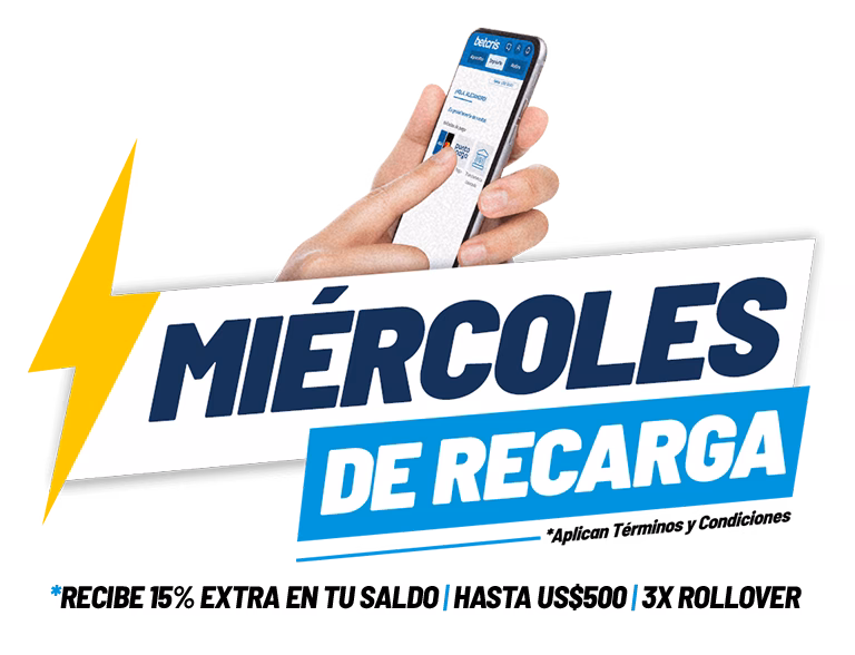 Betcris te ofrece un bono de recarga del 15% hasta un máximo de USD $500 en todos tus siguientes depósitos los días miércoles. Este beneficio aplica en depósitos por cualquier método de pago. Para aprovecharlo, lo único que debes hacer es seleccionar el bono RECARGA15 en nuestro cajero en línea en el momento que gestiones tu depósito.